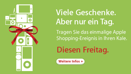 Schnäppchen und zur Erledigung der ersten Weihnachtseinkäufe. Auch Apple beteiligt sich mit seinem Online Store Jahr für Jahr an der Rabattaktion. Das Positive für den deutschen Käufer ist dabei, dass Apple sich dabei nicht nur auf den amerikanischen Store beschränkt, sondern die Aktion mittlerweile weltweit durchführt. Wer also noch ein Weihnachtsgeschenk sucht oder sich selbst ein neues Spielzeug mit einem Apfel drauf unter denn Weihnachtsbaum legen möchte, kann heute den einen oder anderen Euro sparen. Hier eine Auswahl der zur Verfügung stehenden Rabatte:
