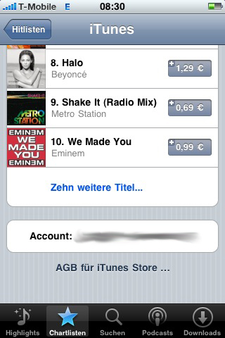 Mit der in der Nacht von Dienstag auf Mittwoch für registrierte Developer veröffentlichten vierten Beta von iPhone OS 3.0 hat Apple den ominösen neuen Menüeintrag "Store" in den Einstellungen mit Leben gefüllt. Diese neue Funktion der Verwaltung von iTunes Accounts auf dem Gerät selbst wirkt sich auch auf die mobilen Varianten des iTunes Store und des AppStore aus. Tauchte dort am Ende z.B. der Chartlisten lediglich eingraviert der jeweils aktive iTunes Account auf, so kann dieser inzwischen auch angeklickt werden. Daraufhin taucht dann ein Dialog auf, der es einem ermöglicht, die Account-Details einzusehen oder sich abzumelden. Hat man letzteres getan, besteht mit dem dann erscheinenden Anmelde-Button wiederum die Möglichkeit, ein Menü einzublenden, welches dieses Mal die Möglichkeit bietet, sich mit einem vorhandenen iTunes Account anzumelden, oder einen neuen Account zu erstellen. Somit sollte in Zukunft die komplette Verwaltung der eigenen iTunes Accounts möglich sein. Ein Klick auf die folgenden Screenshots vergrößert diese.