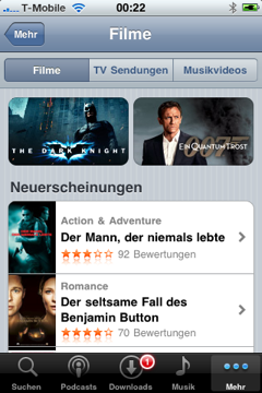 Eben wurde es noch auf der WWDC Keynote angekündigt, nun ist das Feature verfügbar. Mit der GoldMaster-Version von iPhone OS 3.0 (derzeit nur für registrierte Entwickler verfügbar) stehen Filme, TV-Sendungen, Musikvideos und iTunes U nun auch über den mobilen iTunes Store zum Kaufen und Leihen bereit. Hierzu hat sich der gesamte mobile iTunes Store leicht verändert, wie auf den unten angehängten Screenshots zu sehen ist. Der Video-Download ist sowohl über WiFi, als auch über das Mobilfunknetz von T-Mobile verfügbar. Wie lange ein solcher Download allerdings im EDGE-Netz dauern soll, sei mal dahingestellt. Erste Hinweise auf dieses Angebot kamen bereits Mitte April auf und haben sich dann Mitte Mai noch weiter verdichtet. Spätestens mit Veröffentlichung von iPhone OS 3.0 am 17. Juni wird dann jeder die Möglichkeit haben, Filme auch direkt über iPhone und iPod touch kaufen zu können (zumindest in den Ländern, in denen es das Film- und Fernseh-Angebot gibt). Die Preise entsprechen dabei natürlich denen im herkömmlichen iTunes Store.