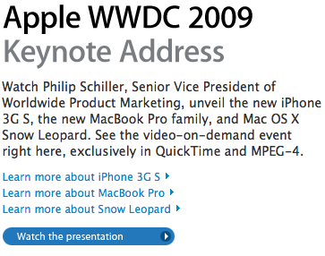 Seit eben steht auf den Apple-Servern der Mitschnitt von Phil Schillers Keynote zur diesjährigen World Wide Developers Conference (WWDC) in San Francisco als QuickTime-Stream bereit. Hier kann man sich nochmal in bewegten Bildern das anschauen, was während der Keynote so alles vorgestellt und angekündigt wurde. Schwerpunkte waren dabei neue MacBook Pros, ein neues iPhone, iPhone OS 3.0 und Mac OS X 10.6 (Snow Leopard). Im Laufe des Tages darf dann davon ausgegangen werden, dass die Keynote außerdem in einer besseren Qualität auch als Podcast über iTunes verfügbar sein wird. Ein Klick auf das unten stehende Bild führt direkt zum Keynote-Stream.
