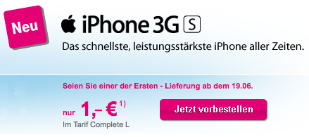 Gestern hat T-Mobile die Tarife und Konditionen zum neuen iPhone 3GS bekannt gegeben, seit wenigen Minuten ist nun auch über die T-Mobile Seiten die Bestellung des Geräts bei Abschluss eines neuen Zweijahresvertrags möglich. Auf der Hauptseite des T-Mobile-Stores wirbt T-Mobile nun mit dem