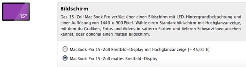 Es war neben dem Wegfall der FireWire-Schnittstelle beim damals noch MacBook heißenden 13" Modell einer der größten Aufreger für Apple Kunden - der Wegfall einer Option für matte Displays bei den Apple Notebooks. Nur das 17" Modell ließ sich optional noch mit einem matten Display bestücken. Bereits vor einigen Tagen kamen Berichte auf, wonach Apple in Zukunft wieder eine Möglichkeit anbieten würde, alle Mac-Rechner auch mit einem matten Display zu bestellen. Nun taucht im Apple Store seit wenigen Stunden das 15" MacBook Pro mit einer Konfigurationsmöglichkeit für ein mattes Display auf, welches ab sofort zu einem Aufpreis von € 45,- geordert werden kann. Erfreulich ist dabei natürlich fest zu halten, dass Apple auf die Wünsche seiner Kunden hört und entsprechend reagiert. Ob und wann auch die anderen Modelle nachziehen werden, steht derzeit in den Sternen. Das 15" MacBook Pro kann ab sofort auch mit mattem Display (über die Konfigurationsoptionen) unter dem folgenden Link direkt im Apple Store erworben werden: MacBook Pro