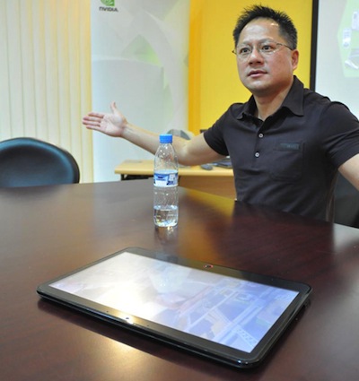 Es ist nach wie vor DAS große Thema in den Apple Gerüchteküchen dieser Welt - der Tablet Mac. Inzwischen kann man einigermaßen sicher davon ausgehen, dass das neue Gerät wohl irgendwann Anfang des kommenden Jahres vorgestellt werden wird. Seit seiner Rückkehr zu Apple soll sich Steve Jobs vorrangig mit diesem Thema beschäftigen. Kein Wunder, schließlich wird es nach dem iPhone aus dem Jahr 2007 mal wieder Zeit für einen echten Paukenschlag. Und ein solcher soll das Tablet wohl werden, schließlich gelangen bislang nur vage Vermutungen an die Öffentlichkeit. So soll es sich ersten Gerüchten zufolge bei dem neuen Mitglied der Mac-Familie um ein Art großes iPhone handeln. Umso interessanter ist das unten zu sehende Foto, welches zum einen NVIDIA CEO Jen-Hsung Hwang zeigt und zum anderen ein bislang unbekanntes Tablet auf dem Tisch. Selbst die in diesem Bereich für gewöhnlich gut informierten Jungs von Engadget haben keine Ahnung, worum es sich bei dem Gerät handeln könnte. Von der Optik her könnte es durchaus einem "großen iPhone" entsprechen. Nun gut, sehen wir es zunächst als weitere Steigerung der Vorfreude...
