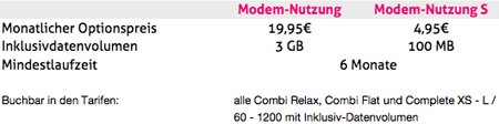 UPDATE: T-Mobile hat die Verfügbarkeit zum 01. Dezember gegenüber Leo vom fscklog inzwischen bestätigt. Entgegen ersten Vermutungen bekommen jedoch auch die Besitzer eines Complete-Vertrags der ersten Generation die Möglichkeit, die Optionen "Modem Nutzung" und "Modem Nutzung S" zu ihrem Vertrag hinzu zu buchen! Offiziell heißt es: "Zusätzlich zur bisherigen Praxis können ab diesem Zeitpunkt auch Bestandskunden in den Combi- und Complete-Verträgen der 1. Generation die Optionen zur Modemnutzung buchen. Die Kapazitäts-Engpässe bei der technischen Umsetzung wurden erfolgreich behoben, so dass beiden Optionen jetzt für