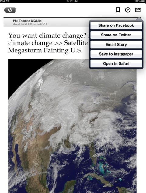 Flipboard (kostenlos im AppStore). Nachdem man sich mit seinem Twitter-Account eingeloggt hat, sieht man den Stream von News und Videos seiner Twitter-Freunde. Dabei werden nicht nur Links angezeigt, sondern direkt die komplette Story. Die Kollegen von