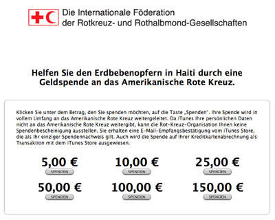 Aufgrund der Aktualität der Ereignisse und der Wichtigkeit des Themas hier noch einmal ein gesonderter Hinweis für die von Apple eingerichtete Sonderseite im iTunes Store über die alle User die Möglichkeit haben, Geldbeträge in unterschiedlicher Höhe für die Erdbebenopfer in Haiti zu spenden.