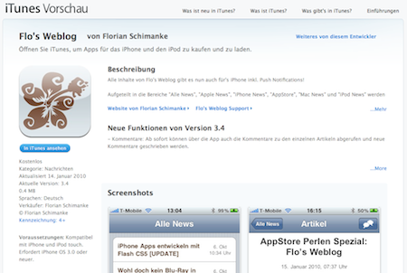 eingeführt. Damit lassen sich die Inhalte des iTunes Stores nicht mehr nur über iTunes, sondern auch über einen Browser betrachten. Klickt man also auf einen Link in den iTunes Store (z.B. den hier), wird zunächst die Browseransicht und schließlich (wenn installiert) im Hintergrund iTunes geöffnet. Diess Angebot baut Apple offenbar Stück für Stück aus. Nachdem Ende letzten Jahres auch Hörproben über den Browser verfügbar gemacht wurden, ist nun auch
