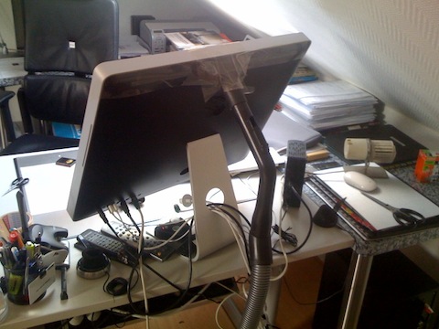 Hier mal ein wenig Spaß zum Wochenende. Gérard berichtete mir heute von seinem defekten iMac, dessen Lüfter offensichtlich den Geist aufgegeben hat. Zumindest startete der Rechner noch, schaltete sich aber nach wenigen Minuten wohl ob des stehenden Lüfters und der damit verbundenen starken Hitzeentwicklung wieder ab. Was also tun, wenn man unbedingt an dringend benötigte Daten gelangen muss? Nun, da ist es wohl an der Zeit, den Heimwerker-King Tim Taylor in uns zu entdecken. Im vorliegenden Fall griff Gérard zu Tesa-Band, bastelte damit einen Miele-Staubsauger an den Lüftungsschlitz an der Rückseite und hielt den iMac damit tatsächlich am Laufen, wenngleich die Lüfterlautstärke gegenüber der Originalkonfiguration wohl doch ein wenig zugenommen haben dürfte. Gérard schreibt dazu: "Optimal läuft der Lüfter bei 300 Watt. Gerät: Miele GALA, farblich auf iMac abgestimmt... Danke auf auch an Beiersdorf. Ohne tesa wär das nix geworden... So kalt war mein Rechenzentrum noch nie... Time Machine läuft und der Termin bei Apple steht! Grüße an Steve Jobs... So wird's gemacht ;-)" Anbei noch ein paar Bilder der abenteuerlichen Konstruktion.