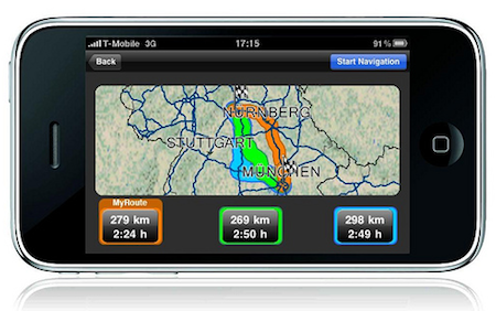 Anfang Februar auf der Macworld San Francisco angekündigt, steht seit wenigen Minuten das Update für den MobileNavigator Europe auf Verson 1.5 zum Download bereit. Das für die eigentliche Navigation wohl wichtigste Feature ist dabei die bereits von anderen Navigon Geräten bekannte Funktion namens "MyRoutes" (oberer Screenshot). In der Pressemitteilung heißt es dazu: "Durch das Feature NAVIGON MyRoutes wird das iPhone zum individuellen Navi. Bei der Routenberechnung berücksichtigt es den persönlichen Fahrstil des Nutzers, den Wochentag und die jeweilige Tageszeit. NAVIGON MyRoutes schlägt dem Fahrer bis zu drei Routen vor, aus denen er frei auswählen kann. Zudem erhält er eine Routenempfehlung ab, die sich an dem bisherigen Fahrverhalten orientiert. Das Feature speichert neben den gewählten Routen auch den Fahrstil des Nutzers und stimmt die zukünftigen Streckenempfehlungen sowie die berechneten Ankunftszeiten darauf ab." Zudem gibt es in Version 1.5 eine Integration von Twitter und Facebook, so dass man seinen Freunden bei Fingertap jederzeit seinen aktuellen Standort übermitteln kann. Per In-App Purchase lässt sich zudem die Funktion "Panorama View3D" hinzukaufen (unterer Screenshot). Aus der Pressemitteilung: "Panorama View3D zeigt auf dem Display die Landschaft nicht als flache Ebene, sondern dreidimensional mit Bergen und Tälern. Diese realitätsnahe Darstellung der Umgebung erleichtert die Wiedererkennung der Streckenführung und Landschaften. iPhone Nutzer können Panorama View3D aus der Applikation über In App Purchase zum Preis von 9,99 Euro erwerben." Der MobileNavigator Europe ist aus meiner Sicht die mit Abstand beste Navigationslösung für das iPhone und kann über den folgenden Link zum Preis von € 89,99 erworben werden: MobileNavigator