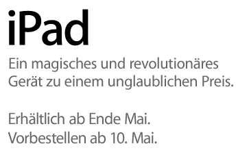 bislang in den USA ein überwältigender Erfolg. " Auch Apples Webseite ist bereits aktualisiert worden und kündigt das iPad nun für "Ende Mai" an. Ab dem 10. Mai kann das Gerät vorbestellt werden. Es kann davon ausgegangen werden, dass man sich das Gerät dann zum Erscheinen nach Hause liefern lassen oder in einem Apple Store abholen kann.