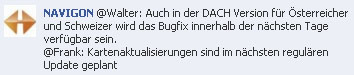 UPDATE: Für alle die sehnsüchtig auf eine Aktualisierung des Kartenmaterials warten, gibt Navigon per Facebook bekannt, dass diese mit dem nächsten regulären Update (also vermutlich auf Version 1.6) zu erwarten ist. Das Update für die D-A-CH Version auf Version 1.5.1 für Kunden in Österreich und der Schweiz (ja, da ist es noch verfügbar) sollte ebenfalls in Kürze bereit stehen. Zudem behebt das 1.5.1 Update die Sprachprobleme unter iPhone OS 4.0.