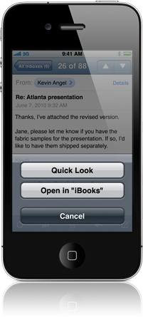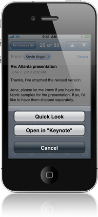 Bei der Vorstellung des iPad Ende Januar präsentierte Apple auch eigens für das neue Gerät angepasste Versionen seiner drei iWork Apps Pages, Numbers und Keynote. Auch wenn bislang offizielle Ankündigungen fehlen, könnten sich diese Apps nun auch auf dem Weg auf das iPhone und den iPod touch befinden. Mit iOS4 wird auch eine Funktion Einzug auf die "kleinen" iGeräte halten, mit der man bestimmte Mailanhänge direkt in einer zugehörigen App öffnen kann. Ein Screenshot auf der offiziellen Feature-Seite von Mail zeigt dabei die Option, einen Anhang in "Keynote" zu öffnen. Ob es sich hierbei um ein bloßes Versehen oder eine Unachtsamkeit vopn Apple handelt, ist offen. Die Zeichen deuten jedoch relativ deutlich nicht nur auf eine iPhone-Umsetzung von iBooks, sondern auch der iWork Apps hin.