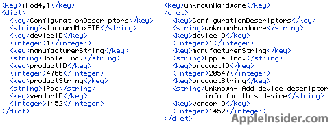 Schon Anfang der Woche hatte der Boy Genius Report in den Untiefen der aktuellen Beta von iOS 4.1 Referenzen für neue iPhones (iPhone3,2 und iPhone3,3) und ein neues iPad (iProd2,1) ausgemacht. Nun legt AppleInsider noch einmal nach und hat weitere, wenn auch zum größten Teil weniger überraschende Referenzen entdeckt. So taucht neben dem bereits entdeckten neuen iPad in den USB-Konfigurationsdateien nun auch erstmals ein "iPod4,1" auf. Die bisherigen Generationen von Apples Touch-iPod trugen die Revisionsnamen "iPod1,1", "iPod2,1" und "iPod3,1" und enthielten jeweils ein signifikantes Update der Hardware, so dass bei dem diesjährigen Gerät hiervon ebenfalls ausgegangen werden kann. Vermutlich wird sich das Innenleben dabei an das des iPhone 4 anlehnen, also einen A4-Prozessor, ein Gyroskop, zwei Kameras mit FaceTime-Unterstützung und das Retina Display enthalten. Wie es sich mit dem Äußeren des neuen iPod touch verhält, ist hingegen noch unklar. Deutlich spannender als die erwartete Vorstellung einer neuen iPod touch Generation ist hingegen die Referenz auf eine "unknownHardware", die in den Dateien auftaucht und eine Apple-Vendor ID trägt. Dieser Platzhalter könnte für das seit einiger Zeit gemunkelte neue Apple TV (iTV) auf iOS-Basis stehen. Sehr wahrscheinlich werden die neuen Produkte gemeinsam mit der finalen Version von iOS 4.1 und einem neuen iTunes anlässlich des alljährlichen September-Events das Licht der Welt erblicken.
