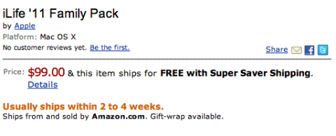 Gerüchte und Hinweise zu iLife ’11 gab es in den vergangenen Wochen immer wieder. Langsam aber sicher kristallisiert sich nun auch ein Zeitrahmen für die Veröffentlichung heraus. Nachdem Amazon bereits in den vergangenen Wochen vereinzelt Fachbücher zur nächsten Version von Apples Softwaresuiten iLife und iWork gelistet hatte, tauchte nun erstmals die neue Software persönlich auf den Seiten des Internethändlers auf. Diese Entdeckung machte TUAW (via MacTechNews) und konnte den unten zu sehenden Screenshot sichern. Demnach müsste iLife ’11 (und vielleicht auch die zugehörige neue Version von iWork) innerhalb der nächsten vier Wochen erscheinen. Dies passt auch einigermaßen zu dem Erscheinungsdatum des bereits vor einigen Wochen von mir entdeckten Buches "iWork ’10 - From Zero to Hero", welches ab dem 10. Oktober bei Amazon erhältlich sein sollte, inzwischen aber auf den 24. Februar 2011 verschoben wurde. Das von TUAW entdeckte iLife ’11 wurde inzwischen wieder aus dem Amazon-Sortiment entfernt, das Gerücht um ein baldiges Erscheinen aber ein weiteres Mal bekräftigt.
