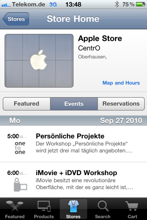 diesen Samstag angesetzt ist. Wem dies als eindeutige Hinweise noch nicht reicht, wird eventuell davon überzeugt, dass der Store im CentrO bereits in Apples (bislang nur im amerikanischen AppStore erhältlicher) Apple Store App auftaucht und dort auch schon Workshop-Termine für die kommende Woche bereit hält (siehe unten). Auch wenn die offizielle Bestätigung seitens Apple noch aussteht, kann die Wahrscheinlichkeit einer Eröffnung an diesem Samstag damit als relativ hoch angesehen werden.