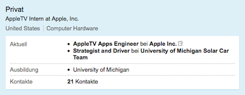 Bereits vor der Vorstellung des neuen Apple TV Anfanag des Monats wurde heftig darüber spekuliert, dass dieses unter iOS laufen würde und die Wahrscheinlichkeit eines eigenen AppStores daher recht hoch sei. Während der Präsentation war davon jedoch keine Rede mehr. Weder sah das Interface nach iOS aus, noch erwähnte Steve Jobs irgendetwas von auf dem Apple TV laufenden Apps. In den vergangenen Tagen verdichten sich jedoch wieder die Hinweise, dass Apple einen solchen Schritt in näherer Zukunft planen könnte. Man hat nicht nur festgestellt, dass tatsächlich iOS 4 auf dem Apple TV läuft (nicht vergessen, das iOS ist das Betriebssystem, nicht die Benutzeroberfläche!), sondern auch aus einem Businessweek-Interview mit Steve Jobs herausgehört, dass Apple Apps für Apple TV anbieten könnte, wenn die Zeit reif dafür ist. Einen weiteren Hinweis will nun Macrumors in einem anonymisierten LinkedIn-Profil (siehe unten) ausgemacht haben, in dem der User sich als "AppleTV Apps Engineer" ausgibt. Allzuviel sollte man dort allerdings meiner Meinung nach nicht hinein interpretieren, da es durchaus sein kann, dass hier jemand einfach nur Aufmerksamkeit erregen will. Allerdings wird sich Apple durchaus etwas einfallen lassen müssen, will man gegenüber dem demnächst startenden Google TV konkurrenzfähig sein. Bei den auf dem Apple TV laufende Apps dürfte es sich allerdings weniger um die bisher erschienenen Apps für iPhone und iPad handeln, als vielmehr um neue, fernsehspezifische Apps. Und wo wir gerade beim Thema sind, Apple hat in den USA offenbar damit begonnen, die Kreditkarten von Frühbestellern des neuen Apple TV zu belasten. Ein in der Regel untrüglicher Hinweis darauf, dass die Auslieferung unmittelbar bevorsteht.
