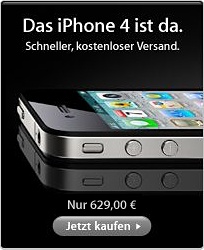 Ab morgen ist das iPhone in Deutschland offiziell nicht mehr nur bei der Telekom, sondern auch bei Vodafone und O2 zu haben. Aufgrund der Tatsache, dass O2 das iPhone 4 auch ohne SIM-Lock und Vertragsabschluss anbieten wird, stellte sich die Frage, ob man Apples Mobiltelefon demnächst auch direkt im Apple Online Store wird bestellen können. Eine offizielle Antwort auf diese Frage lässt zwar weiterhin auf sich warten. Wer aber aktuell einen Blick in den Apple Store wirft, kann schon deutlich erahnen, dass Apple das iPhone ab morgen auch selbst über den Apple Store vertreiben wird. Zum einen lässt sich nämlich auf der Startseite des Stores der unten zu sehende Banner inkl. Verkaufspreis entdecken, zum anderen finden man auf den iPhone-Seiten im Store inzwischen den Hinweis "Dein neues iPhone. Direkt von Apple und sofort einsatzbereit. Dein