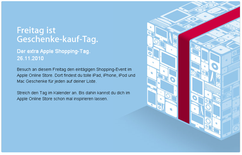 In den USA steht am Freitag nach Thanksgiving traditionell der Black Friday an, der den Beginn des Weihnachtsgeschäfts markiert. Viele Familien nutzen den Freitag nach dem Feiertag als Brückentag und gehen ausgiebig shoppen, was die Händler dazu veranlasst hat, teils kräftige Preisnachlässe anzubieten. Auch Apple hat sich in den vergangenen Jahren sowohl mit seinen Retail Stores, als auch mit dem Online Store an dieser Aktion beteiligt. Seit einigen Stunden schlagen nun auch die Mail-Ankündigungen für den diesjährigen Black Friday am kommenden Freitag auf. Welche Produkte im einzelnen dabei reduziert werden, wird jedoch erst am Tag selbst bekannt gegeben. Nimmt man jedoch die Grafik auf der Ankündigung als Indiz, dann dürften bei den Macs erneut der iMac und der eine oder andere Vertreter aus der MacBook-Familie reduziert werden. Zudem sind auch verschiedene iPod-Modelle, das iPad, AirPort-Stationen, die drathlose Apple-Tastatur sowie die Magic Mouse zu erkennen. Zudem dürfte Apple wie auch in den vergangenen Jahren verschiedene Zuberhöre am Black Friday reduzieren. Sobald die genauen Produkte und die zugehörigen Preise feststehen, werde ich sie hier bekannt geben. Ein wenig Appetit kann man sich eventuell schon einmal in der Aufstellung des vergangenen Jahres holen. Am Montag geht es übrigens direkt weiter. Dann sind im Rahmen des "Cyber Monday" Preisreduzierungen unter anderem bei Amazon zu erwarten.