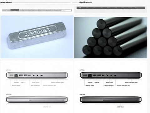 großen Aktualisierung ausstattet. Das letzte größere Update datiert vom Oktober 2009, das letzte kleinere vom Juli 2010, was vom Zyklus her den März als möglichen Erscheinungstermin für eine kleinere Aktualisierung wahrscheinlich werden lässt. Die Kollegen von 9to5Mac spekulieren bereits über den möglichen Einsatz von Liquid Metal und sehen in der kürzlich überarbeiteten Apple-Webseite ein Indiz auf optische Veränderungen der Mac-Gehäuse. Weg von der hellen Alu-Optik und hin zu einer etwas dunkleren Liquid Metal-Optik. Aus meiner Sicht wäre dies aber doch ein bisschen sehr weit her geholt. (Grafik via Macrumors-Forum)