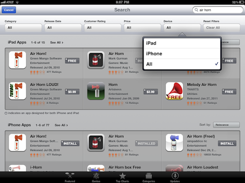Apple hat über Nacht eine kleine, aber durchaus erwähnenswerte Änderung am AppStore auf dem iPad vorgenommen. So findet man nun am oberen Rand verschiedene Filter, mit denen sich unter anderem Suchergebnisse weiter eingrenzen lassen. Hiermit kann man nähere Angaben zu den Suchergebnissen, wie Kategorie, Erscheinungsdatum, Bewertungen, Preis und Gerät (iPhone, iPad, beides) machen. Ein weiterer Button setzt die Filter schließlich wieder zurück. Schön ist ebenfalls, dass man die Suche nun verlassen und später wieder zu ihr zurückkehren kann, ohne das die Suchergebnisse vergessen werden. Man landet also an derselben Stelle, an der man die Sucher verlassen hat. Ebenfalls verändert wurde das Verhalten der "Kaufen"-Button. Ab sofort erkennt der AppStore auf dem iPad nicht nur die aktuell auf dem Gerät installierten Apps und zeigt statt "Kaufen" "Installiert" an. Hat man bereits eine App gekauft, diese aber aktuell nicht auf dem Gerät installiert, erscheint nun ein Button "Installieren" statt "Kaufen", was bei vielen vor allem neuen Nutzern sicher für weniger Verwirrungen beim erneuten Download einer App führen dürfte. Derlei Änderungen bedürfen keines iOS-Updates, da sowohl der AppStore, als auch iTunes auf den iOS-Geräten komplett webbasiert sind und somit von Apple jederzeit auf den Servern verändert werden können. Abschließend noch ein Screenshot der Kollegen von 9to5Mac.