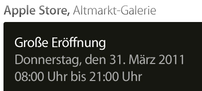 Mit dem Apple Store in der Dresdner Altmarkt Galerie eröffnete heute der erste Apple Store im Osten Deutschlands. Trotz der für Arbeitnehmer und Schüler äußerst unpopulären Zeit an einem Donnerstagmorgen um 08:00 Uhr bildete sich die gewohnt lange Schlange vor den Eingängen des Einkaufszentrums. Ein Kompliment an die Organisatoren der Eröffnung. Die Schlangenführung war gut durchdacht und nach Eröffnungskunden und iPad 2 Käufern getrennt. Die ersten 1.500 Besucher erhielten wie gewohnt ein T-Shirt mit der Aufschrift "Altmarkt-Galerie". Wer es bis in den Store geschafft hat, kann sich auf ca. 500 Quadratmetern von den wie immer kompetenten Apple Mitarbeitern zu den ständig 150 ausgestellten Produkten beraten lassen. Die Eröffnung in Dresden markiert übrigens das Ende der längsten Pause zwischen der Eröffnung zweier Stores weltweit. Seit dem letzten Store sind insgesamt 138 Tage vergangen. Der vorherige Rekord lag bei 105 Tagen. Diese Zeilen stammen übrigens von einem MacBook Pro aus den Verkaufsräumen. Einige Fotos von der Eröffnung gibt es in meiner MobileMe Galerie (mit Dank an Holger!). Im Anschluss noch das obligatorische Einlaufvideo in den Store.