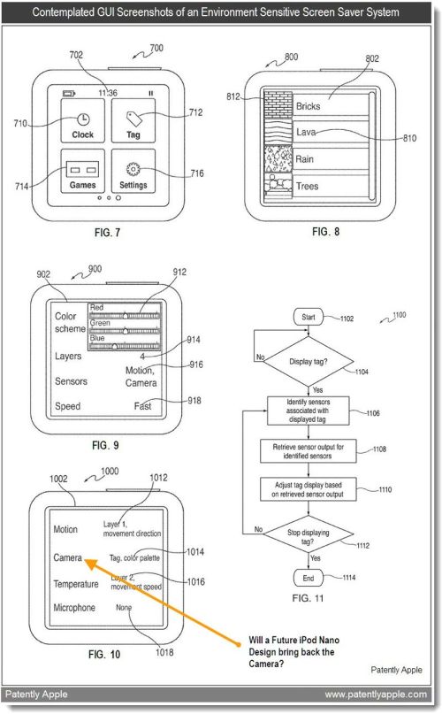 Die Gerüchte zum vermutlich im September kommenden nächsten iPod nano nehmen erstaunlich früh Fahrt auf. Nachdem aus Fernost bereits zweimal Fotos eines nano-Gehäuses mit einer Aussparung für eine (Video-)Kamera aufgetaucht sind (hier und hier), befeuert nun auch ein Apple-Patent die Gerüchte um eine Rückkehr der Kamera in den nano, wie die Patentspezialisten von Patently Apple herausgefunden haben. Hierin ist deutlich die Rede von einer Kamera in besagtem Gerät. Doch nicht nur das. Der nano könnte dem Patent zufolge künftig auch über Umgebungssensoren verfügen, die dann unter anderem dafür genutzt werden könnten, um auf dem Display einen an die jeweilige Umgebung angepassten Bildschirmschoner laufen zu lassen. Als einer dieser Umgebungssensoren könnte dabei dann auch die Kamera dienen. Zudem könnten Dinge wie Bewegungen, Geräusche und die aktuelle Temperatur ermittelt werden. Dem Patent zufolge könnte auch die Geräteausrichtung ermittelt werden, so dass die abgebildeten Regentropfen immer nach unten fallen. Auf einer der Konzeptzeichnungen des Homescreens ist darüber hinaus auch eine Referenz für Spiele zu sehen. Hierbei könnte es sich allerdings auch um einen bloßen Platzhalter handeln. Der Antrag stammt übrigens interessanter Weise aus dem November 2009, wurde also ziemlich genau ein Jahr vor der Vorstellung des aktuellen iPod nano Formfaktors eingereicht. (via MacRumors)