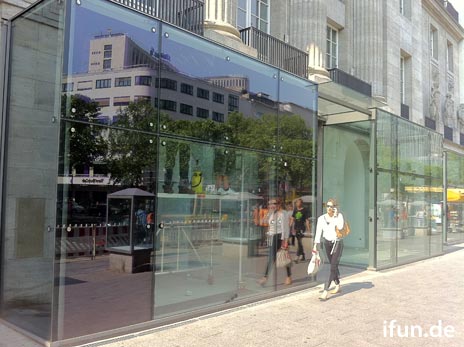 Innenausbau bereits weitgehend abgeschlossen sein, so dass unter anderem bereits Kabel und Anschlüsse verlegt sind. Heute Nachmittag folgte dann die obligatorische schwarze Verhüllung der ebenfalls bereits verglasten Front. In der Regel vergeht nach diesem Akt nicht mehr allzu viel Zeit bis zur Eröffnung eines Stores. Allerdings taucht ein Berliner Store bislang noch mit keinem Sterbenswörtchen in Apples Stellenanzeigen auf. Personal sollte aber auch in der Hauptstadt für den Betrieb eines Stores benötigt werden. Außer einer recht lockeren Anzeige vor einiger Zeit bei einer externen Stellenagentur fehlt hiervon jedoch bislang jede Spur. Sollte die Renovierung aber tatsächlich weiter so schnell voranschreiten, ist dies wohl nur noch eine Frage der Zeit. Abschließend noch ein Bild von der Außenansicht. Weitere Bilder gibt es über die oben verlinkte Seite bei iFun.