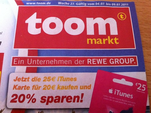 iTunes-Geschenkkarten zu ermäßigten Preisen bei natürlich gleichbleibendem Wert verschleudert werden. Dieses Mal ist die Verbrauchermarktkette Toom an der Reihe, vergünstigte Geschenkkarten anzubieten. So erhält man in dieser Woche 20% Rabatt auf die € 25-iTunes-Karten und zahlt somit nur € 20,-. Wie es aussieht, ist die Aktion hinsichtlich