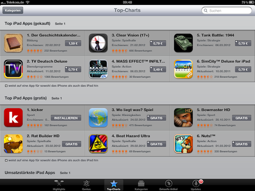 Apple hat in der vergangenen Nacht eine leichte Überarbeitung des AppStore auf dem iPad vorgenommen. Da es sich dabei lediglich um für das iPad aufbereitete Web-Inhalte handelt, war hierfür kein iOS-Update notwendig. Augenscheinlich wird dies vor allem bei den AppStore-Charts, die sich nun nicht mehr vertikal, sondern horizontal scrollen lassen. Hierdurch entfällt unter anderem auch die Notwendigkeit, nach 25 Titeln einen Button zum Laden der nächsten 25 Apps zu drücken. Auf diese Weise wirkt der gesamte Prozess deutlich schlanker und flüssiger. Zudem hat Apple eine neue Kategorie mit dem Namen "Kataloge" eingeführt, die zwar noch nicht komplett aktiv ist, jedoch über den angegebenen Link bereits erreicht werden kann. Ein Zusammenhang mit dem heutigen Event ist durchaus möglich. In diesem Fall könnte dann auch der eine oder andere neue Inhalt präsentiert werden.