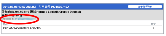 Verwirrung gibt es indes weiterhin um die Wahl von Hermes als neuen Versandpartner in Deutschland. Inzwischen hat Apple zwar schon fleißig die Frühbesteller über den Versand des neuen iPad informiert, das Trackingsystem von Hermes weiß hiervon allerdings noch nichts. Prinzipiell kann es das auch noch nicht, da Apple offiziell noch gar nicht mit den korrekten Trackingnummern von Hermes (14-stellige Nummer beginnend mit 71...) herausrückt. Will man sie erfahren, kann man sich an die Apple Hotline wenden, oder sich eines kleinen Tricks bedienen. Im chinesischen Apple Store (mit diesem Link geht es direkt zum Bestellstatus) werden sie nämlich interessanter Weise auch für deutsche Besteller angezeigt (siehe Screenshot unten). Allerdings kennt das Hermes-Tracking auch diese Nummer noch nicht. Laut Aussage einer Leserin (danke, Angelika!) glaubt man bei Hermes selbst nicht an eine fristgerechte Zustellung und bei Apple meint man, Hermes habe Probleme mit der EDV und dem Nachpflegen der Scans. Wollen wir also hoffen, dass sich die Wahl des neuen Versandpartners nicht als Debakel entpuppt.