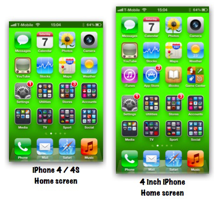 Eine interessante Überlegung bringt nun The Verge ins Spiel. So könnte Apple die kurze Seite des Displays bei 640 Pixeln belassen, während lediglich die lange Seite verlängert wird, bis die 4" in der Diagonale erreicht sind. Dies würde für ein 4"-Retina-Display in etwa 1152 Pixeln entsprechen, verglichen mit 960 Pixeln beim aktuellen 3,5"-Display. In einer Reihe von Illustrationen werden das so gestreckte Display und der gewohnte Formfaktor verglichen. So hätten durch die Verlängerung der langen Seite künftig fünf statt vier App-Reihen auf dem Home-Screen Platz. Für die meisten Drittanbieter-Apps dürfte auch die Anpassung nur einen moderaten Aufwand nach sich ziehen. Im Beispiel meiner App würde dies lediglich bedeuten, dass in der Übersicht mehr Artikel und in der Artikelansicht mehr Text angezeigt würde. Nicht angepasste Apps könnten, ähnlich wie iPhone-Apps auf dem iPad, mit einem schwarzen Balken oben und unten in ihrer herkömmlichen Größe angezeigt werden.