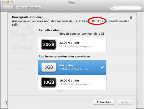 Das Verwalten des Speicherangebots lässt sich sowohl auf den iOS Geräten, als auch unter OS X Lion vornehmen. Hier kann sowohl ein Up- als auch ein Downgrade auf die kostenlos in iCloud enthaltenen 5 GB durchgeführt werden. Hier sollte man in jedem Fall vor dem 30. September einen Blick hinein werfen.