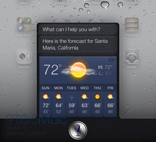 Die WWDC ist gerade mal noch eine Woche entfernt und wie erwartet beginnt langsam aber sicher das Trommelfeuer der Gerüchte. Im Zentrum des Geschehens steht heute ganz eindeutig iOS 6, welches wohl auf der Keynote am kommenden Montag erstmals präsentiert und in einer ersten Beta-Version an die registrierten Entwickler verteilt wird. Mit der allgemeinen Veröffentlichung ist dann gemeinsam mit dem neuen iPhone im Herbst zu rechnen. Dann soll laut Informationen der Kollegen von 9to5Mac auch endlich Siri seinen Weg auf das iPad finden. Nicht wenige User waren enttäuscht, dass dies nicht bereits mit dem neuen iPad der Fall war. Damit einhergehend sollen dann auch diverse, nicht telefon-spezifische Siri-Features des iPhone 4S auch auf das iPad gelangen. Hierzu zählen unter anderem die Steuerung der Musik-App, iMessages, Kalender, Erinnerungen, Karten und Safari, sondern auch der Zugriff auf das aktuelle Wetter. Während das iPad aktuell keine Apple-eigene Wetter-App vorweisen kann, zeigt das Mockup unten, wie die Umsetzung aussehen könnte. Speziell diese soll eines der großen Probleme bei der Portierung von Siri auf das iPad gewesen sein. Die auf dem Mockup gezeigte Umsetzung würde mir auf jeden Fall gut gefallen. Unklar ist dem Bericht zufolge aber welche iPads in den Genuss von Siri kommen werden. Allerdings sieht es danach aus, dass es wohl nur das neue iPad werden wird. Auch ist nicht gesichert, ob Siri für das iPad bereits auf der WWDC gezeigt oder als Highlight für das wahrscheinliche Herbst-Event zurückgehalten wird. Sollten Siri-API für Entwickler kommen, dürfte die WWDC aber die geeignetere Plattform sein.