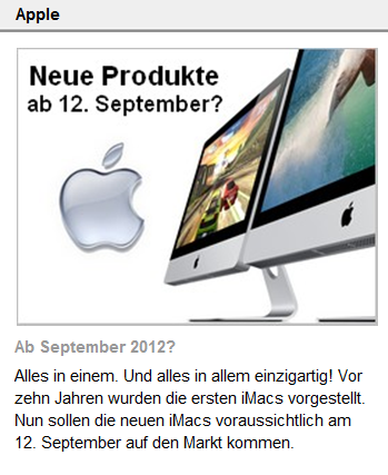 "Event-Gerüchte: iPhone, iPods, iPad und Zubehör" vollständig lesen Eigentlich mag ich nicht so recht dran glauben, dass Apple auf dem Event in der kommenden Woche neben dem neuen iPhone auch neue Macs präsentiert. In der Vergangenheit hatten sich solche Events immer dadurch ausgezeichnet, dass sie eigentlich keinen Produktmix boten, sondern sich auf eine Produktkategorie fokussierten. Es verdichten sich aktuell aber die Hinweise darauf, dass es in der kommenden Woche doch soweit sein könnte und der iMac sein erstes Update seit über einem Jahr spendiert bekommt. So berichten unisono Fox und der Boy Genius Report, dass es in der kommenden Woche die neuen Modelle geben wird, wenngleich man kurz darauf wieder zurück ruderte und nun statt von "nächster Woche" nur noch von "bald" spricht. Allerings gibt es auch noch weitere Hinweise. Analog zu den bereits vermeldeten Ankündigungen bei der Lufthansa, spielt sich aktuell bei BMW (siehe Bild unten) dasselbe ab (mit Dank an Dirk für den Hinweis!). Und wie die Kollegen von iFun berichten, verschickt ein großer Mac-Händler in Deutschland aktuell E-Mails mit dem Hinweis, dass Apple aktuell keine iMacs mehr an Händler ausliefere. Auch dies würde also für ein iMac-Update in der kommenden Woche sprechen. Ob dieses dann auf der Event-Bühne verkündet wird, oder einfach durch ein Update des Apple Online Store ist momentan ebenso unklar, wie die Frage, ob es in der nächsten Woche tatsächlich schon soweit ist.