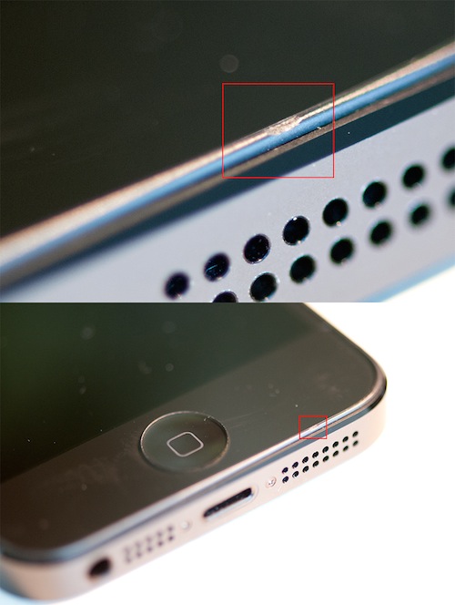 Bereits vorhin hatte ich in meinem ersten Eindruck vom iPhone 5 erwähnt, dass es diverse Berichte im Internet gibt, die von Kratzern und Macken auf der schwarzen Beschichtung auf dem Metallrahmen des Geräts zeugen. Inzwischen hat sich diese Zahl noch einmal erhöht, so dass Apple langsam aber sicher ein ähnliches Szenario wie beim iPhone 4 mit dem legendären "Antenna-Gate" droht. Und so macht auch jetzt bereits der Begriff "Scuff-Gate" (scuff = Abnutzung) die Runde. Die Hardware-Experten von iFixit haben inzwischen die Geräte untersucht und dabei an den eloxierten Aluminiumkanten des iPhone 5 kleinere Abschürfungen und Kratzer festgestellt, die auch bei meinem Gerät zu sehen sind. Offenbar liegt dies daran, dass die Beschichtung an den Kanten nicht sonderlich dick und damit widerstandsfähig ist. So kann hier auch bei normalem Gebrauch nach kurzer Zeit schon das unter der Beschichtung liegende Rohmaterial zum Vorschein kommen. Zudem gibt es auch Berichte über noch tiefere Macken im Gehäuserand, wie sie u.a. mein Leser Marco feststellen musste: