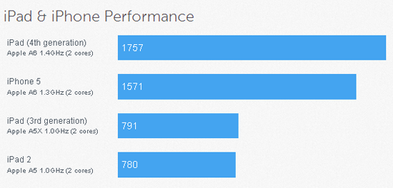 Eigentlich gelangt das iPad der vierten Generation erst am kommenden Freitag in den Handel. Dennoch hat es bereits ein Gerät in die Benchmark-Datenbank von Geekbench geschafft. Grundsätzlich lassen sich solche Einträge auch fälschen, die zu sehenden Werte werden jedoch von den meisten Beobachtern als realistisch eingeschätzt. Bereits auf dem Event in der vergangenen Woche hatte Apple angegeben, dass der neue A6X-Prozessor eine bis zu doppelt so schnelle Leistung gegenüber dem Vorgänger mit A5X-Prozessor liefern soll. Die in der Geekbench-Datenbank zu sehenden Ergebnisse bestätigen dies. Demzufolge ist der A6X-Prozessor des neuen iPad 1,4 GHz ein wenig höher getaktet, als der A6-Chip im iPhone 5 (1,3 GHz). Dies ergibt in Sachen Prozessorleistung einen Wert von 1.757 Punkten gegenüber dem iPhone 5 mit 1.572 Punkten. Deutlich verbessert zeigt sich auch die Geschwindigkeit des integrierten Arbeitsspeichers, der wie beim Vorgängermodell mit einer Kapazität von 1 GB angegeben wird. Im täglichen Gebrauch werden sich die Verbesserungen nicht im selben Maße auswirken, wie eventuell durch den Geekbench-Test zu vermuten. Dennoch dürfte sich auch hier eine Leistungssteigerung gegenüber dem iPad 3 bemerkbar machen.