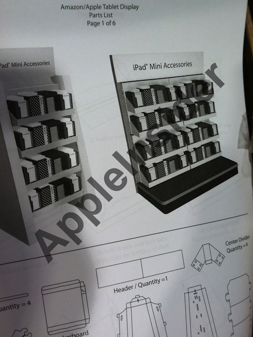 Display Parts List" trägt und die mit einem Vermerk versehen wurde, wonach sie nich zu öffnen sei. Angeblich ist die Anleitung "zufällig herausgefallen". Es ist nicht klar, für welchen Händler die Regale bestimmt sind, AppleInsider sieht aber Parallelen zu den Aufstellern bei größeren US-Händlern wie Best Buy or Target. Bereits gestern tauchte eine recht umfangreiche Liste von Hüllen für das iPad mini auf, auf der unter anderem auch so namhafte Hersteller wie Belkin, Kensington und Trust gelistet waren.