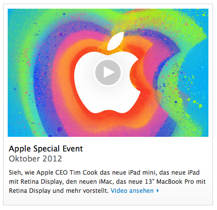 Apples heutiger iPad Mini Event ist bereits Geschichte und man kann mit den Neuvorstellungen aus meiner Sicht durchaus zufrieden sein. Das iPad mini war weitestgehend so erwartet worden, ebenso das 13" Retina MacBook Pro und der neue Mac mini. Echte Knalleffekte hatte Apple allerdings in der Tasche, als man die vierte Generation des iPad vorstellte und einen unglaublich dünnen neuen iMac präsentierte. Insofern haben sich einige, aber nicht alle der im Vorfeld gehandelten Gerüchte und Leaks bewahrheitet. Gefehlt haben unter anderem die erwarteten Auftritte von iTunes 11 und iOS 6.1. Inzwischen ist es auch möglich, sich die Veranstaltung und damit auch die Vorstellung der neuen Produkte noch einmal in Ruhe in bewegten Bildern anzuschauen. Hierfür steht auf den Apple-Servern der Mitschnitt der Keynote als QuickTime-Stream bereit. Ein Klick auf das Bild unten führt direkt zum Keynote-Stream. Im Laufe der Nacht dürfte Apple auch noch den Podcast mit dem neuen Video aktualisieren.