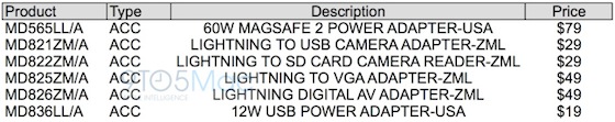 Nur noch wenige Momente sind es bis zu Apples heutigen Special Event unter dem Motto "We've got a little more to show you." auf dem mit an Sicherheit grenzender Wahrscheinlichkeit ein kleineres iPad präsentiert wird. Die in den vergangenen Tagen aufgekommenen Gerüchte können noch einmal kompakt in meinem iPad Mini Event Gerüchte-Roundup nachgelesen werden. Aber auch kurz vor dem Event schießen weiter kräftig Gerüchte aus dem Boden. So werfen die Kollegen von 9to5Mac erneut Teilenummern ins Netz, die offenbar für diverses Zubehör stehen, welches heute Abend präsentiert oder anschließend im Store erhältlich sein soll. So wird es wohl für das iPad Mini (und das neue iPad mit Lightning-Connector?) zwei neue Adapter geben, die bislang kombiniert als "Camera Connection Kit" verkauft wurden. Somit wird es nun einen "Lightning auf USB"-Adapter für das direkte Anschließen einer Kamera an den Lightning Connector und einen "Lightning auf SD-Card"-Adapter geben, die beide für jeweils $ 29,- in den Verkauf gehen sollen. Der auf der Liste zu sehende 60-Watt MagSafe Adapter wird ziemlich sicher für das 13" Retina MacBook Pro gedacht sein. Der neue USB Stromadapter für die neuen iPads liefert nun 12 statt bislang 10 Watt, was für einen Geschwindigkeitsschub bei der oft kritisierten, recht langen Ladezeit des neuen iPad sorgen könnte.
