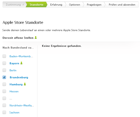 Satte zehn Retail Stores betreibt Apple inzwischen in Deutschland. Mit den bereits im Umbau befindlichen Ladengeschäften in Berlin und Hannover werden in Kürze zwei weitere hinzu kommen. Angeblich sei man auch an weiteren Stores in der Kölner und Stuttgarter Innenstadt interessiert, befindet sich dort aber noch auf der Suche nach passenden Locations. Ein paar weitere Indizien deuten nun darauf hin, dass Apple demnächst auch mit Brandenburg ein weiteres Bundesland zu seiner Liste mit Retail Stores hinzufügen könnte. So taucht aktuell noch ohne genaue Ortsangabe bereits Brandenburg in den Retail-Stellenausschreibungen auf den Apple Webseiten auf. Nimmt man dann noch hinzu, dass Apple bereits diverse Stores in den ECE-Einkaufscentern in ganz Deutschland betreibt, bietet sich für einen möglichen Standort das Stern-Center in Potsdam an. Dieses befindet sich aktuell in einer Umstrukturierung, die im kommenden Jahr abgeschlossen sein soll. Perfekt also, um bei dieser Gelegenheit auch einen Apple Store dort zu eröffnen, wie es in einem ähnlichen Szenario unter anderem bereits in der Altmarkt-Galerie in Dresden der Fall war. Der Eintrag mit den drei Punkten (...) im Screenshot unten ist übrigens der Eintrag für Niedersachsen (Hannover).