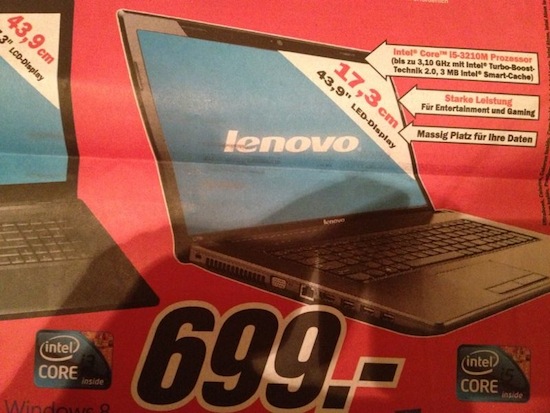 Ja, richtig gelesen. Und es gibt ja auch genügend Anzeichen. In Zeiten in denen Notebooks immer kleiner und dünner wurden, wuchsen die Displaydiagonalen von Mobiletelefonen in letzter Zeit wieder stärker an. Zuletzt zu sehen bei der Vergrößerung des iPhone-Displays von 3,5" auf nun 4" beim iPhone 5. Und auch auch bei den Notebooks scheinen sich die Zeiten des Schlankheitswahns, zu dem nicht zuletzt Netbooks und das MacBook Air beigetragen haben, dem Ende zu neigen. So deute ich zumindest den Ansatz von Lenovo, den man mit dem im aktuellen Media Markt Prospekt beworbenen Modell beschreitet. (mit Dank an Nina!) Das Gerät für schlanke € 699,- kommt mit einer Displaydiagonalen von satten 43,9" daher und dürfte somit vor allem unter Filmfreunden, die auch gerne unterwegs ein Heimkino dabei haben wollen, eine Menge Anhänger finden. Auch etwas stabiler gebaute Menschen werden sich freuen, die Tasten künftig nicht nur fummelig-filigran mit dem Finger bedienen zu müssen, sondern direkt die komplette Faust nutzen zu können. Bleibt abzuwarten, wann Apple diesem Trend folgt und ein erstes "MacBook Maxi" oder "iPad giant" auf den Markt bringt...