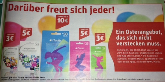 Nachdem sich in der vergangenen Woche gleich mehrere Anbieter von vergünstigten iTunes-Karten um die Gunst der Käufer stritten, gibt es auch in dieser Woche wieder gute Nachrichten für alle Schnäppchenjäger. So sind es aktuell die Supermarkt-Kette REWE und die Drogeriemärkte von Rossmann, die die Karten zum vergünstigten Preis anbieten und damit allen Apple-Usern ein kleines Ostergeschenk machen. Bei REWE erhält man in dieser Woche auf alle iTunes-Geschenkkarten einen Rabatt von 20%. Aber Achtung: Die Aktion gilt nur bis, Samstag, den 30. März 2013, bzw. solange der Vorrat reicht. Bei Rossmann sind lediglich € 25,- Karten um 20% reduziert. Hier läuft die Aktion bis zum 28. März 2013. Die Anzahl der Karten pro Kauf ist offenbar bei beiden Angeboten nicht begrenzt.Man sollte also im Zweifel schnell sein, um noch rechtzeitig zuschlagen zu können. Schließlich haben die Karten ja kein Verfallsdatum. Der aufgedruckte Wert der Karten kann sowohl für Musik, als auch für Fernsehserien, Filme und Einkäufe im Mac- und iOS-AppStore genutzt werden. (mit Dank an Christopher, Peter und Patrick!)