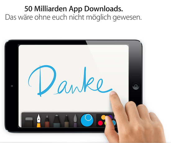 Vor dreizehn Tagen hatte Apple den Countdown zum 50 milliardsten Download aus dem iOS AppStore gestartet. Am heutigen Abend nun wurde diese magische Marke geknackt. Auf Apples Webseite, die in den vergangenen Tagen von einem stetig hochzählenden Countdown (Ist das nicht eigentlich ein Widerspruch in sich? Egal.) geziert wurde, prangt seither ein iPad mini mit der Aufschrift "Danke". Auch wenn der Google Play Store mit inzwischen 48 Milliarden Downloads dem AppStore dicht auf den Fersen ist, ist die Zahl nach wie vor sehr beeindruckend. Nur nochmal zur