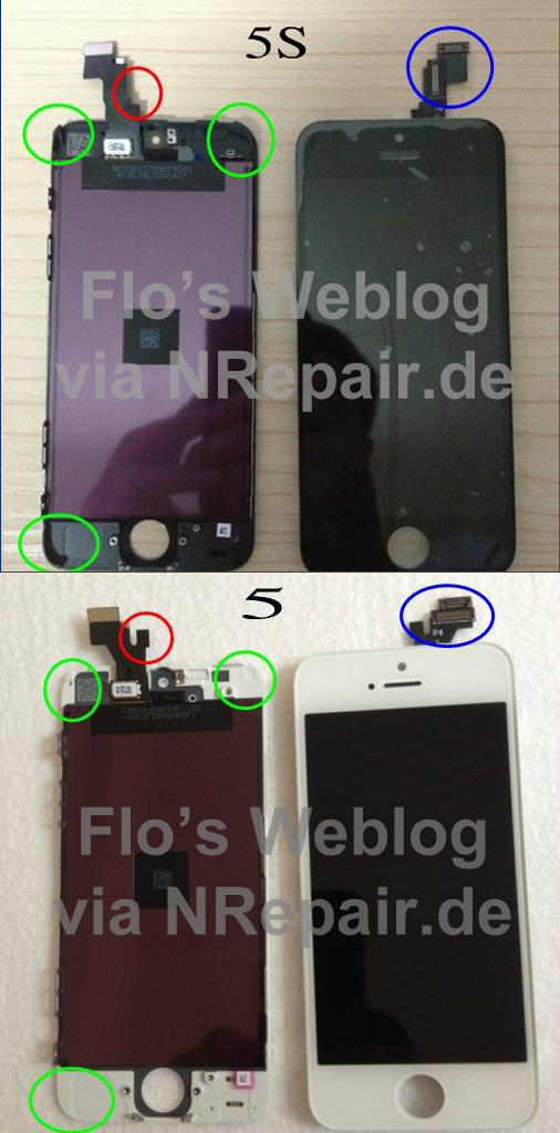 Nachdem gestern bereits ein Foto eines vermeintlichen Logicboards für das kommende iPhone 5S im Internet seine Runden drehte, wurde mir von dem iPhone-Reparateur NRepair.de ein Vergleichsfoto zugespielt, welches nicht nur zu dem gesichteten Logicboard passt, sondern auch die Veränderungen der Frontpanels der aktuellen und der kommenden iPhone-Generation aufzeigt. Bei den Anschlüssen veränderte Apple auf dem Logicboard die Verbindung zwischen der Platine und dem Display, sowie dem Digitizer, der für die Entgegennahme und Verarbeitung der Touchgesten zuständig ist. Beim iPhone 5S ist einer dieser Anschlüsse horizontal, der andere vertikal ausgerichtet, was zu dem unten zu sehenden Flexkabel am Frontpanel für das iPhone 5S passen würde. Auch wenn Apple alle zwei Jahre ein äußerlich mit dem Vorgänger so gut wie identisches "S-Modell" auf den Markt bringt, sind die internen Veränderungen doch meist signifikant. Auch beim iPhone 5S wird es also wieder interne Veränderungen geben. Inwieweit diese mit einem möglichen Fingerabdruckssensor oder NFC-Chip zusammenhängen, ist allerdings aktuell noch nicht abzusehen.