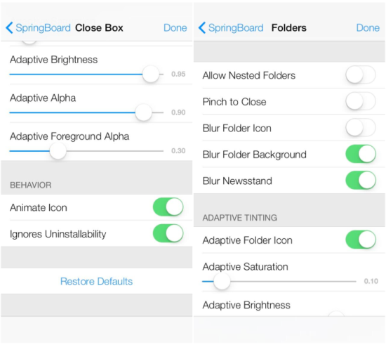 Weitere interessante Einstellungen zeigen eine Option zum Ausblenden der vorinstallierten Apps. Eine Möglichkeit, die sich verschiedene Nutzer schon seit geraumer Zeit wünschen. Auch ein Schalter, der die Möglichkeit aktiviert, Ordner innerhalb von Ordnern zu erzeugen, existiert in den versteckten Systemoptionen. Ebenso, wie eine Pinch-Geste, um einen Ordner wieder zu schließen. Darüber hinaus finden sich verschiedene Einstellungen für die farbliche Gestaltung von iOS, wie z.B. für Blur-Effekte, die Farbgebung allgemein und Animationsgeschwindigkeiten.