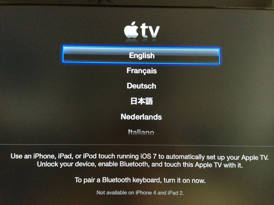 Zusätzlich zu der bereits gestern vermeldeten Möglichkeit, endlich wieder Musik über das Apple TV direkt am Fernseher kaufen zu können, bringt die dritte Beta der Apple TV Software 6.0 eine weitere interessante Neuerung mit, die durchaus auch einen Blick in die Zukunft sein könnte. So kann man ein unkonfiguriertes Gerät künftig mit einem iOS 7 Gerät per Bluetooth automatisch konfigurieren lassen. Hierzu fordert der neue Startbildschirm auf. Dazu muss das Apple TV mit einem Gerät auf dem iOS 7 läuft und Bluetooth aktiviert ist, berührt werden. Am besten legt man sein iPhone dabei auf die kleine schwarze Box. Nach kurzer Zeit erkennt das Apple TV automatisch die Verbindung und führt den Benutzer durch den Prozess. Dabei wird dann über das iPhone die Apple ID abgefragt, die sich das Apple TV auch merken kann. Anschließend startet die automatische Konfiguration. Dabei werden unter anderem auch die WLAN-Einstellungen automatisch vom iPhone übernommen, was das lästige Eintippen des Kennworts über die kleine silberne Apple Remote überflüssig macht. Nicht automatisch aktiviert wird allerdings die Privatfreigabe, so dass man nicht unmittelbar die Remote-App auf dem iPhone zur Steuerung nutzen kann. Dies muss erst über die silberne Apple Remote aktiviert werden.