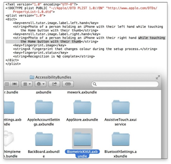 Ein Fingerabdruckssensor wird für das iPhone 5S bereits seit geraumer Zeit gehandelt. Nun gibt es erste konkrete Hinweise hierfür. Die Kollegen von 9to5Mac haben in den Tiefen der am heutigen Abend veröffentlichten vierten Beta von iOS 7 Codezeilen entdeckt, die auf eine solche Komponente in einem kommenden iPhone hindeuten. So wurde dort eine neue Bibliothek gefunden, die auf den Namen "BiometricKitUI" hört und verschiedene Textbausteine enthält, die wohl aus einem Tutorial für die Benutzung des Fingerabdruckssensors stammen. Konkret heißt es dort: "Photo of a person holding an iPhone with their left hand while touching the Home button with their thumb", "Photo of a person holding an iPhone with their right hand while touching the Home button with their thumb", "A fingerprint that changes colour during the setup process." und "Recognition is %@ complete".