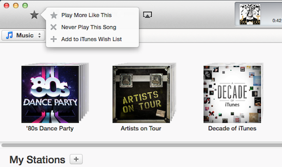 Zusammen mit der vierten Beta von iOS 7 hat Apple am heutigen Abend auch eine erste Vorabversion von iTunes 11.1 für seine Entwickler veröffentlicht. Das Besondere daran: Erstmals lässt sich das auf der WWDC präsentierte und wohl im Herbst, gemeinsam mit iOS 7 startende iTunes Radio auch auf dem Mac blicken. Wie unter iOS 7 wird iTunes Radio aber auch in iTunes zunächst ausschließlich in den USA verfügbar sein. Verfügt man jedoch über einen US-amerikanischen iTunes Account, kann man auch hierzulande bereits einen Blick auf Apples neuen Streaming-Dienst werfen. Die Bedienung ist dabei ähnlich der auf den iOS-Geräten, wirkt jedoch aufgrund der stark verteilten Einstellungsmöglichkeiten, Buttons und Steuerungselemente noch ein wenig konfus. Fangen wir oben links an. Statt des Zurück-Buttons findet man einen Stern, der bei einem Klick ein kleines Menü offenbart, über das sich der gerade laufende Song auf die iTunes-Wunschliste setzen, als Favorit markieren oder von diesen ausschließen lässt. Erworben werden kann der jeweils laufende Song über einen Preis-Button im Fortschrittsfenster oben in der Mitte.