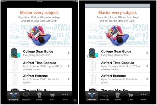 Die Apple Store App auf einem iPad mini im 2x-Modus unter iOS 6 (links)