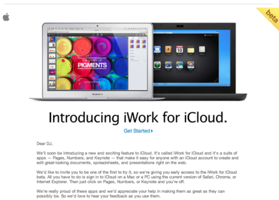just click on Pages, Numbers, or Keynote and you’re off." Apple wünscht sich von den Testern Feedback hinsichtlich des neuen Dienstes. Auf welcher Basis Apple die Personen auswählt ist nicht bekannt. Diese können die iWork-Web-Apps jedoch über die normale iCloud-Webseite nutzen und müssen nicht über beta.icloud.com gehen.